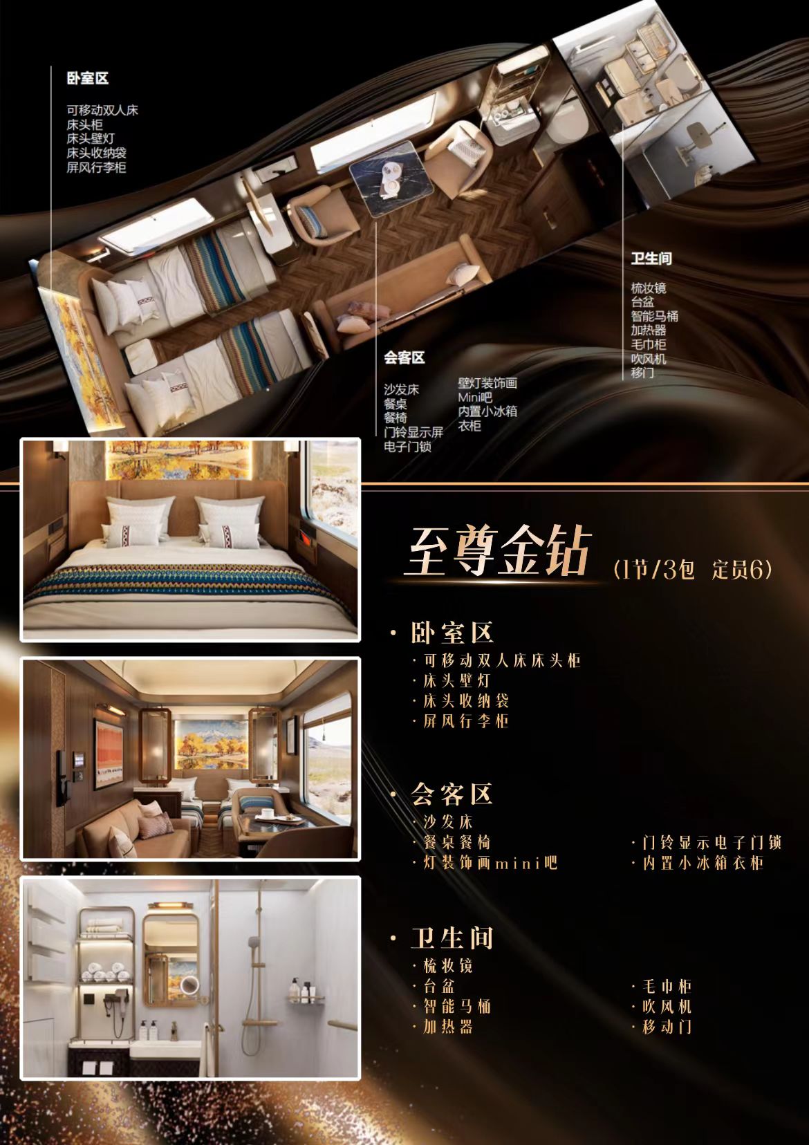 3、至尊金钻(3包): 69999元/人(1节车共3包间,定员6人,均有独立卫浴)