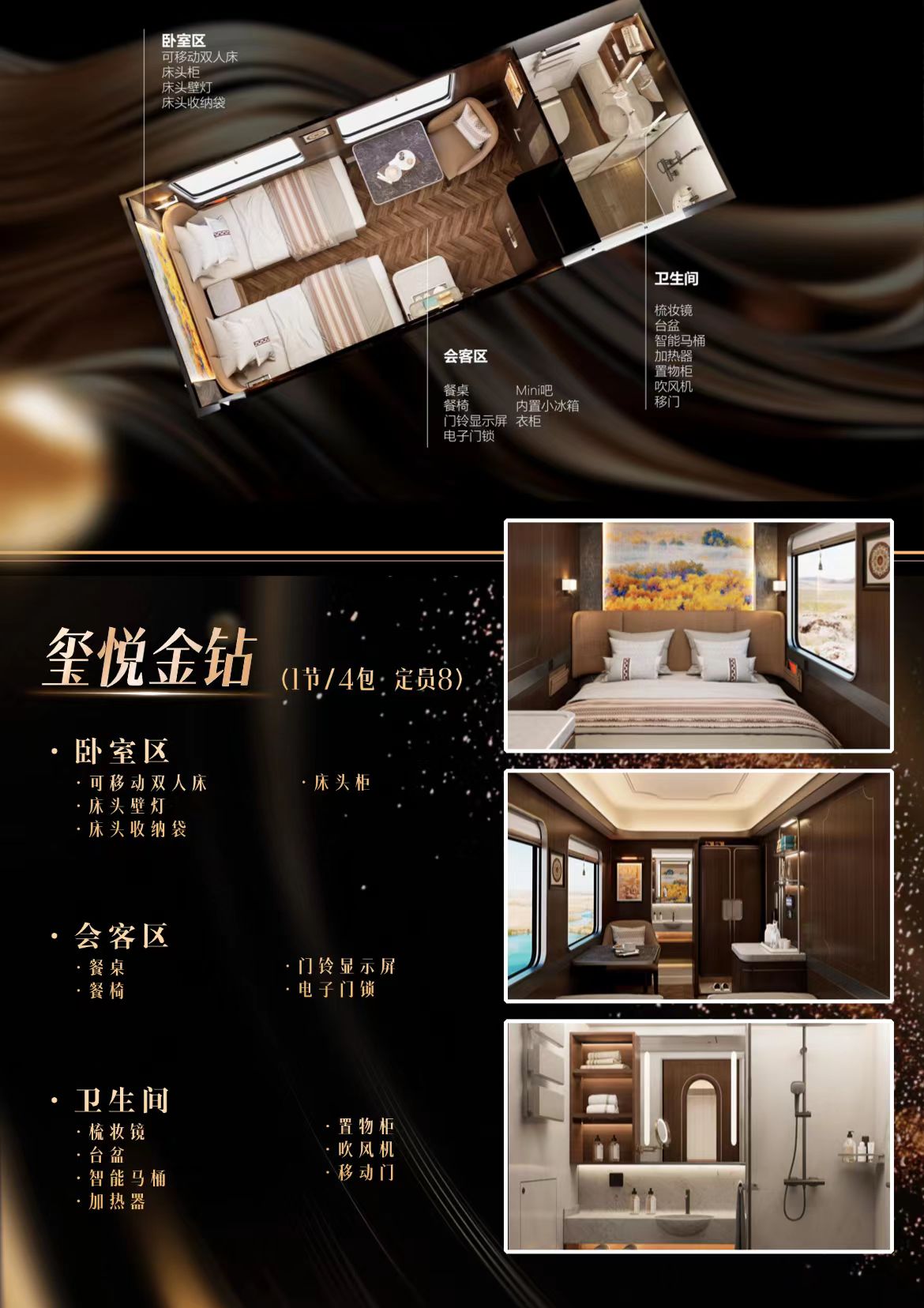 2、玺悦金钻(4包): 65999元/人(1节车共4包间,定员8人,均有独立卫浴)