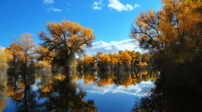 3:在水面或者湿地上拍摄胡杨林的倒影,非常有层次感: