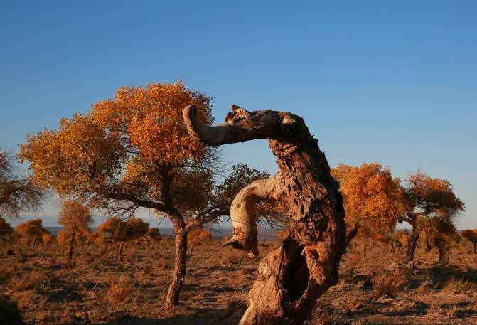 乌尔禾区现有胡杨林近30万亩,主要是分布在百口泉与乌尔禾城区之间的原始万亩胡杨林、白杨河大峡谷胡杨林、乌尔禾镇胡杨部落,以及世界魔鬼城和艾力克湖之间戈壁滩胡杨林。游历完世界魔鬼城,我们直接驱车前往10多公里外的原始胡杨林景区。这虽然是新疆最小的胡杨林区,但却是迄今为止被发现最古老的胡杨林之一,存活的胡杨树龄达千年之久。胡杨,它生如夏花之绚烂,死如秋叶之静美,是大漠里完美生命的象征。由于常年受盐碱地浸泡,风沙的袭扰,这里的胡杨有着别处没有的独特造型,深入其中,你会看到各种扭曲的风景。它也是地球上树龄最高的胡杨林,漫步其中,你会看到各种形态各异千奇百怪的造型,仿佛雕刻作品一般,这就是乌尔禾胡杨。