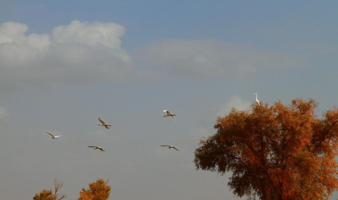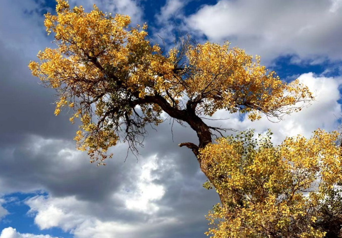 胡杨"生长在茫茫沙漠中,活着一千年不死,死后一千年不倒,倒后一千年不朽"。作为我国沙漠的唯一乔木树种,生长在最恶劣、最残酷的气候环境之中,每一颗树干都沉淀了岁月,烙印了疾风的刀口,桠枝上挂满金灿灿的叶子。维吾尔语称胡杨为"托克拉克",意为"最美丽的树",的确美丽而壮烈,可远观可仰望不可亵玩。
