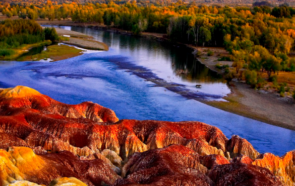一河两岸异景:地处额尔齐斯河北岸,南岸是绿洲、沙漠与蓝天,北岸是五彩斑斓的奇石怪岩,两岸景色截然不同,通过阿克吐别克钢索桥相连,形成独特景观。